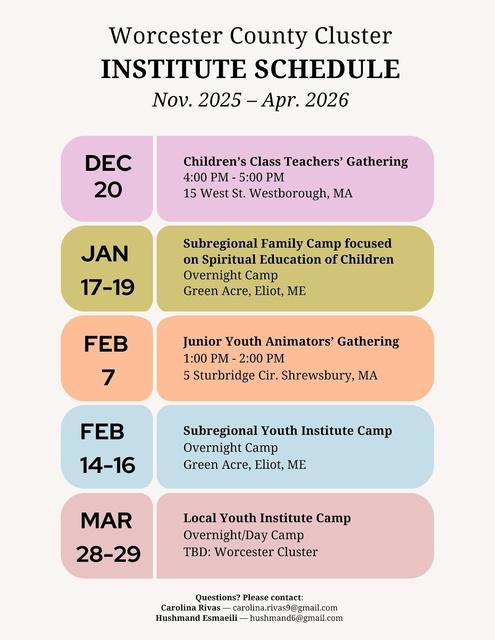 Young adult devotional in Worcester. (Contact Hushmand Esmaeili for information, hushmand6@gmail.com.)